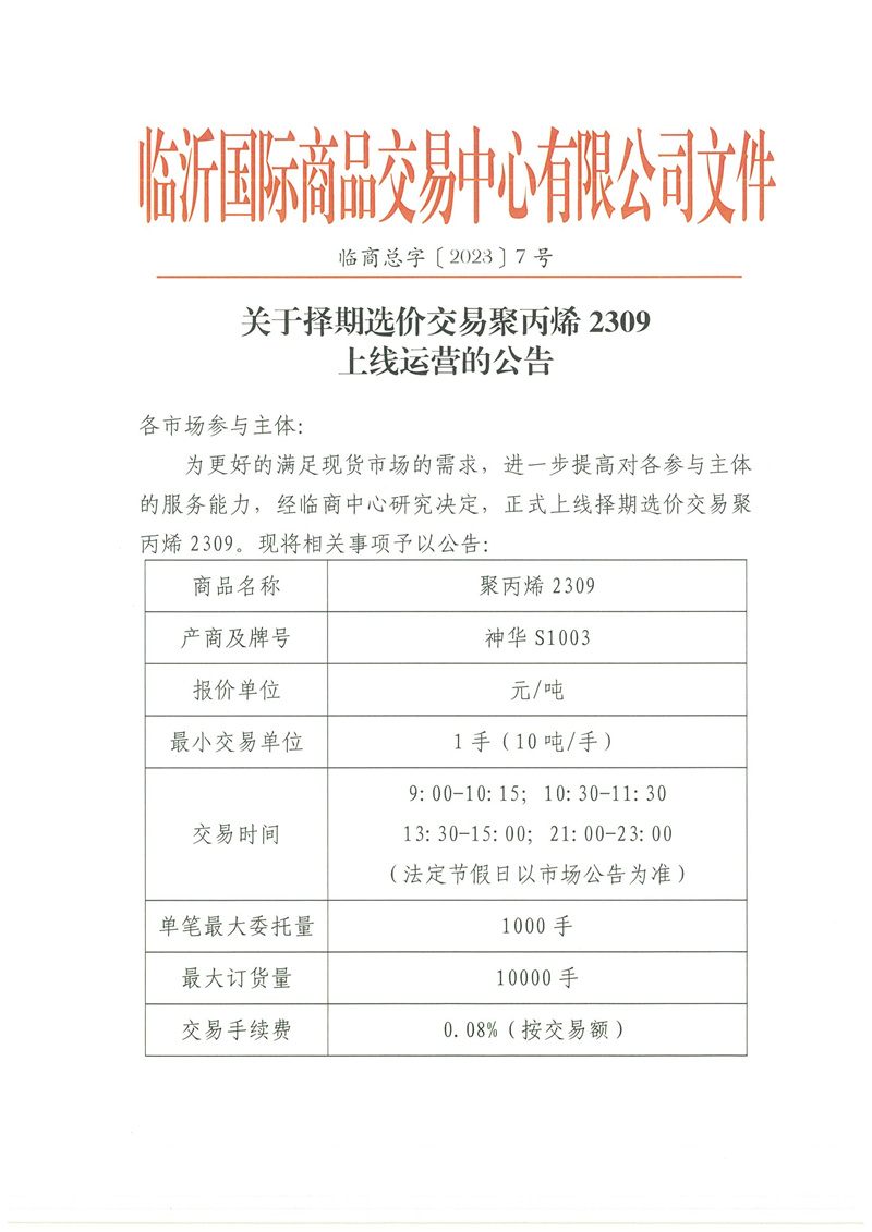 关于择期选价交易聚丙烯 2309上线运营的公告