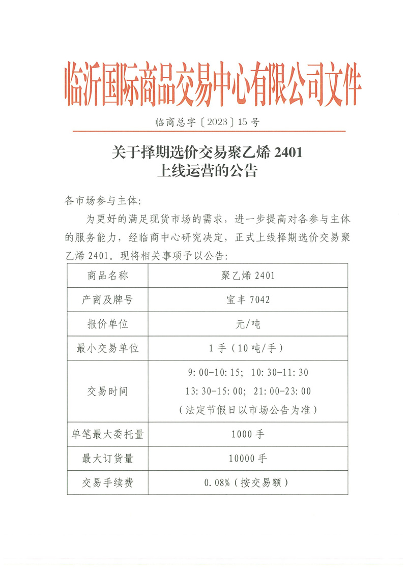 关于择期选价交易聚乙烯 2401上线运营的公告