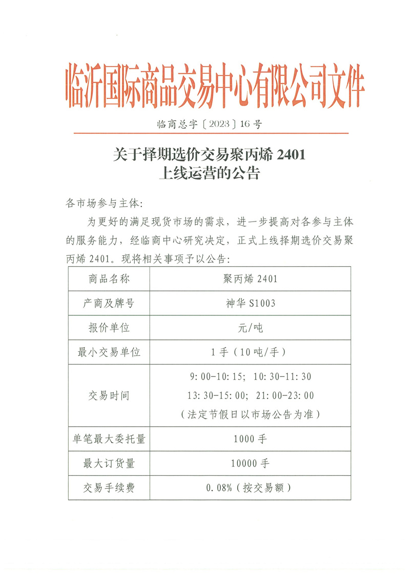 关于择期选价交易聚丙烯 2401上线运营的公告