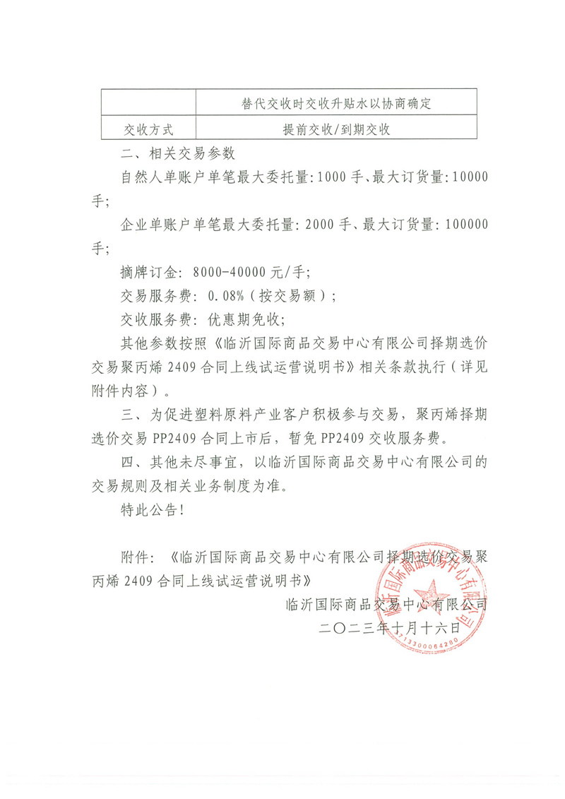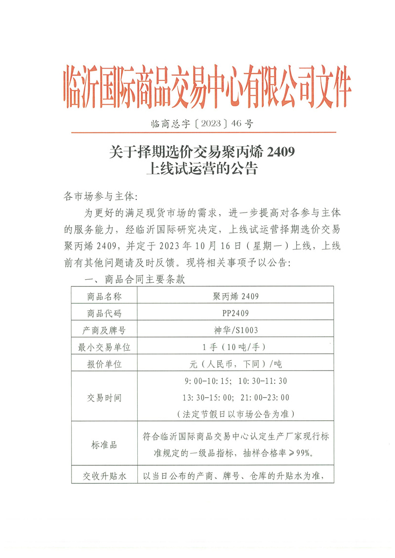 关于择期选价交易聚丙烯 2409上线试运营的公告