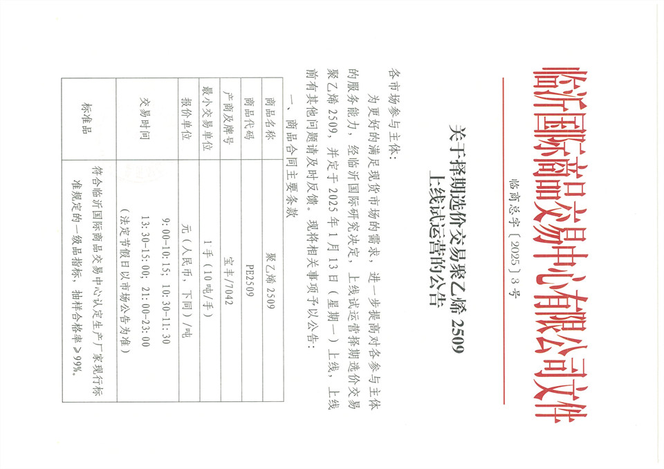 关于择期选价交易聚乙烯2509上线试运营的公告