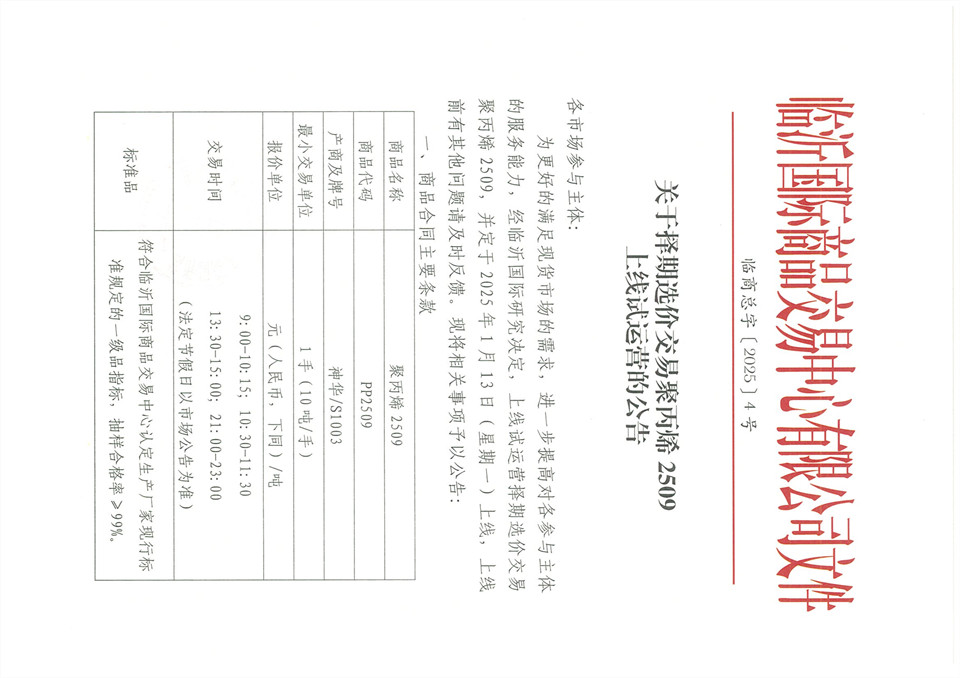 关于择期选价交易聚丙烯2509上线试运营的公告